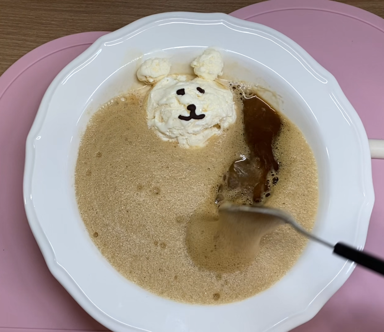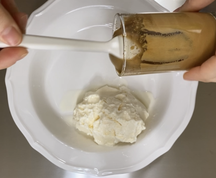 만든 커피 거품을 아이스크림 위에 골고루 펴 발라요. 코코아가루나 슈가파우더가 있다면 살짝 뿌려주면 완벽!